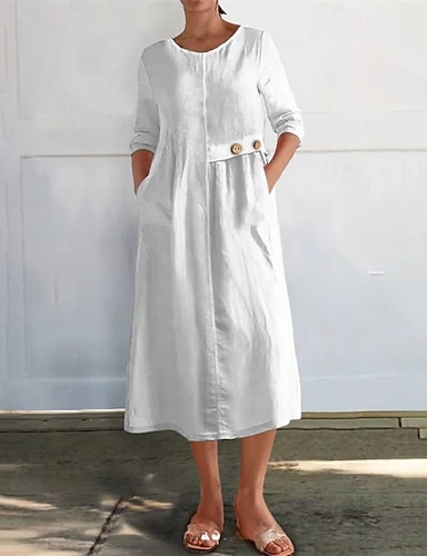 Damen Langes Kleid Maxikleid Freizeitkleid Baumwoll-Leinenkleid Mode Modern Täglich Date Wochenende Normale Passform Einfach Langarm Rundhalsausschnitt Schwarz Weiß Rote Khaki Frühling Herbst