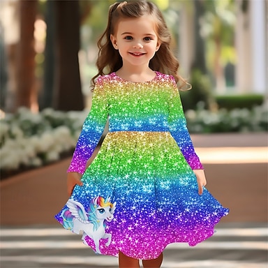 Mädchen' 3D Regenbogen Einhorn Kleid Langarm Sommer Frühling Urlaub Täglich Ferien Prinzessin Schön Süß Kinder 4-12 Jahre Freizeitkleid A Linie Kleid Knielang Normale Passform