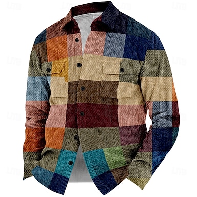 Herren Plaid Geometrische Muster Cord Hemd Hemdjacke Overshirt Langarm Vintage Brautkleider schlicht Formal Alltagskleidung Herbst Winter Umlegekragen Hemden mit Kragen Knopf 3D-Druck 2 Taschen 1pc
