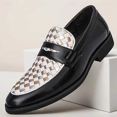 Herren-Loafer aus schwarz-weißem, gewebtem Kunstleder mit Metallakzent, elegante Slip-On-Abendschuhe für Business, Partys und formelle Anlässe