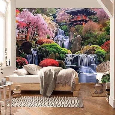 Naturlandschaft mit gestuftem Wasserfall, Sonnenschein, Berglandschaft, grünem Wald und bunten Blumen – Wandteppich, Wandbehang, Wohndekoration, Wohnzimmer, Schlafzimmer, Hintergrund, drinnen und