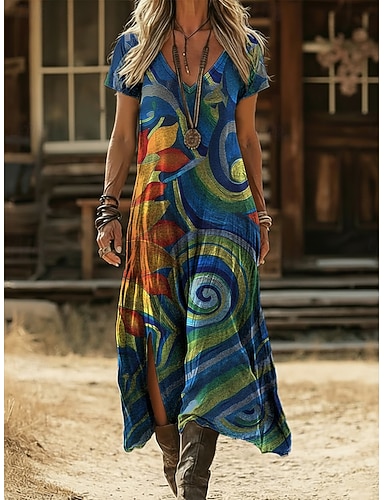 Damen Langes Kleid Maxikleid Freizeitkleid Schwingkleid Klassisch Modern Täglich Urlaub Lässiger Schnitt Grafik Halbarm Tiefer V-Ausschnitt Rosa Orange Grün Dunkelblau Frühling Herbst Winter