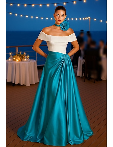 A-Linie Bodenlang Abendkleid Ballkleid Festliche Kleidung Elegant Farbblock seidig Ärmellos Schulterfrei Hochzeit Formell Tasche Satin mit Falten Tasche Schulterblume