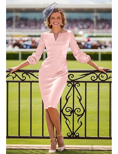 Schlauchkleid Knielang Partykleid Cocktailkleid Kleid für Hochzeitsgäste Brautmutterkleid Dreiviertelarm V Ausschnitt Elegant Minimalistisch Formell Hochzeitsgast Stretch Satin mit Schärpe / Band