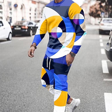 Herren Trainingsanzug Hoodies Set Gelb Königsblau Blau Grau Rundhalsausschnitt Graphic Geometrisch 2 teilig Bedruckt Sport & Natur Casual Sport 3D-Druck Strassenmode Sportbekleidung Basic Frühling