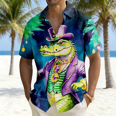 Karneval Herren Krokodil Schmuck Karnival Hemd Sommerhemd Knopfhemd Kurzarm Vintage-Retro Ferien Sommer Umlegekragen 3D-Druck Leinenähnliches Hemd Blau