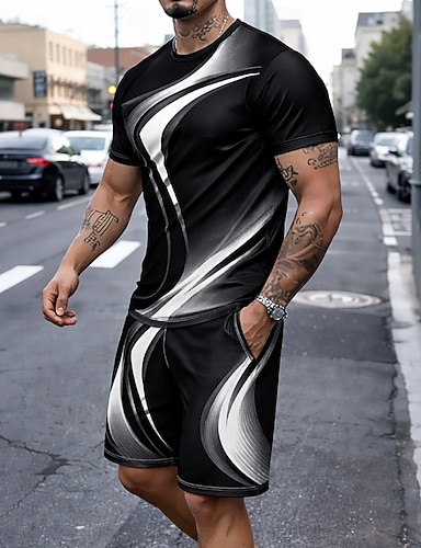 Herren Geometrisch Linie 2St T-Shirts-Sets Sommeroberteile Kurzarm Kurze Hosen Rundhalsausschnitt Sport Lässig Täglich Urlaub Ausgehen 3D-Druck Sommer Blau Schwarz Rote