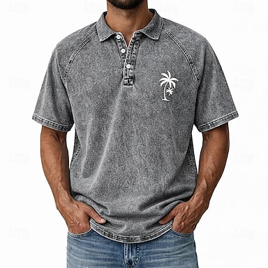 Herren Poloshirts Hemd aus 100 % Baumwolle in Säurewaschung Lässig Ferien Kragenlos Kurzarm Mode Basic Palme Knöpfe Jahrgang Sommer Frühling Blau Rote Purpur Grün Grau Poloshirts
