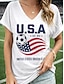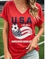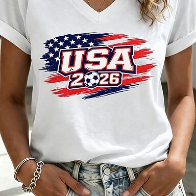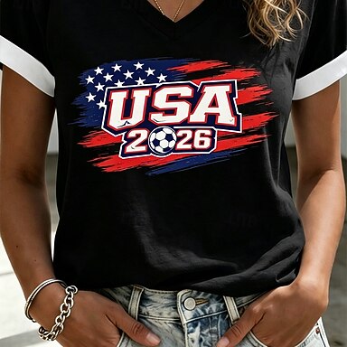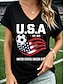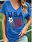 Damen-Fußball-T-Shirt mit Print, Vintage-Stil, klassisch, Kurzarm, V-Ausschnitt, Regular Fit, für Alltag und Wochenende, in Blau, Schwarz, Weiß und Rot, Sommer und Frühling