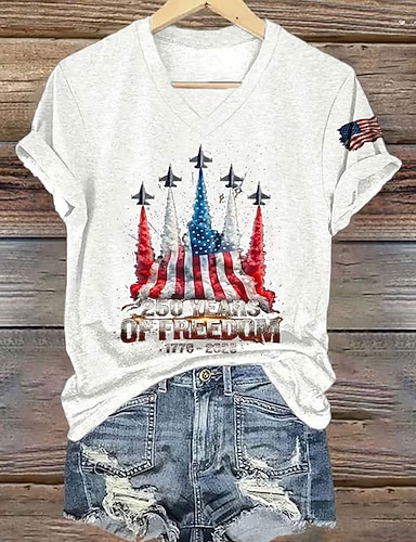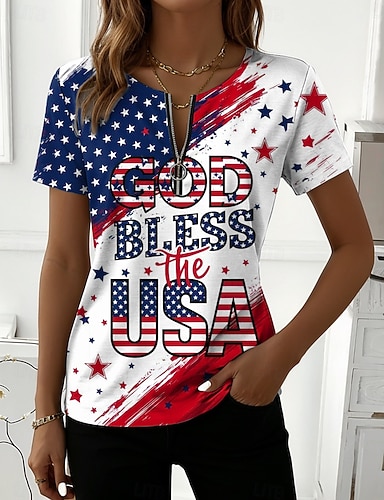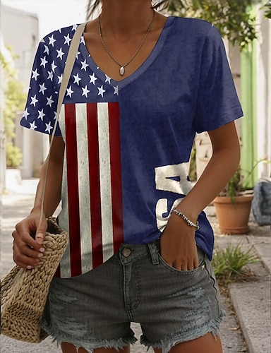 Amerikanischer Unabhängigkeitstag Damen T Shirt Druck Grafik Flagge Vintage Stilvoll Klassisch Kurzarm V Ausschnitt Normale Oberteile Täglich Blau Schwarz Weiß Rote Sommer Frühling