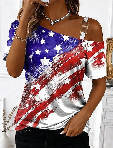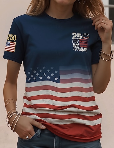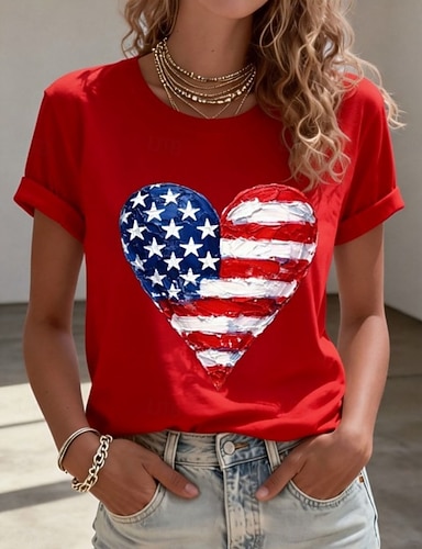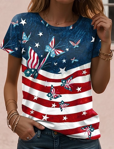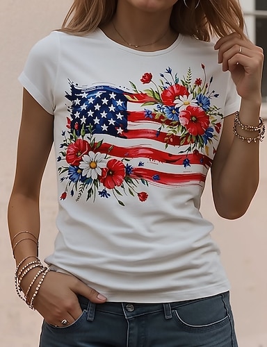 Amerikanischer Unabhängigkeitstag Damen T Shirt Druck Grafik Flagge Stilvoll Klassisch Lässig Kurzarm Rundhalsausschnitt Normale Oberteile Täglich Blau Schwarz Weiß Rote Sommer Frühling