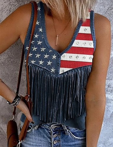 Amerikanischer Unabhängigkeitstag Damen Tank Top Druck Grafik Flagge Vintage Tropisch Stilvoll Ärmellos V Ausschnitt Normale Oberteile Täglich Schwarz Weiß Rote Marineblau Sommer Frühling