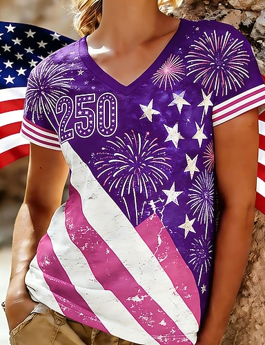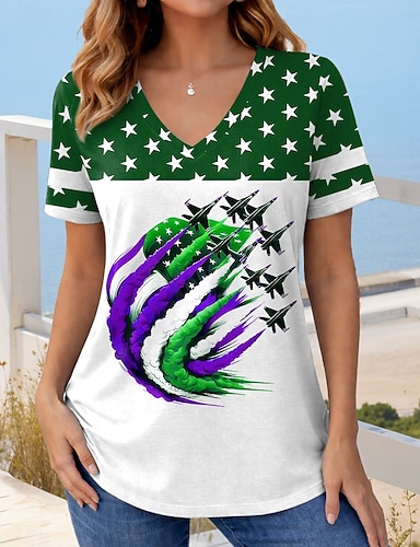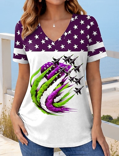 Amerikanischer Unabhängigkeitstag Damen T Shirt Farbblock Druck Grafik Flagge Stilvoll Klassisch Lässig Kurzarm V Ausschnitt Normale Oberteile Täglich Rote Purpur Grün Sommer Frühling