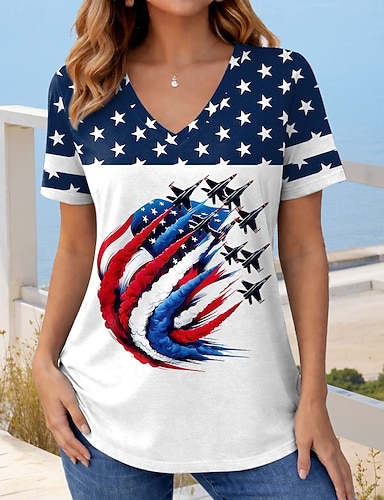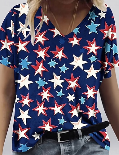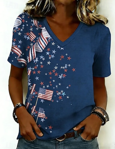 Unabhängigkeitstag Patriotisches Damen T-Shirt Flagge Flagge Nationalflagge Stilvoll Lässig Rot Weiß Blau Kurzarm V-Ausschnitt Reguläre Oberteile Alltag Druck Blau Sommer Frühling