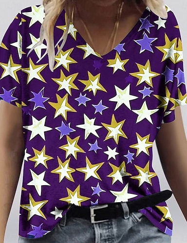 Amerikanischer Unabhängigkeitstag Damen T Shirt Druck Grafik Flagge Stilvoll Klassisch Lässig Kurzarm V Ausschnitt Normale Oberteile Täglich Gelb Rote Purpur Sommer Frühling