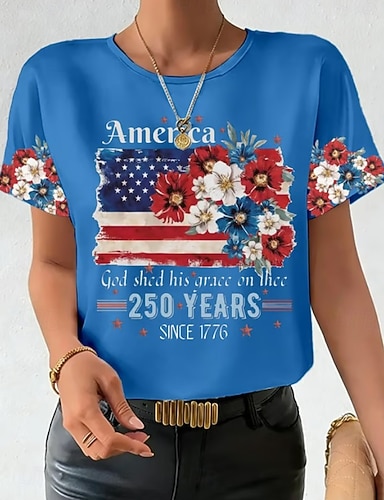 Amerikanischer Unabhängigkeitstag Damen T Shirt Druck Grafik Flagge Stilvoll Klassisch Lässig Kurzarm Rundhalsausschnitt Rundhals Normale Oberteile Täglich Blau Weiß Rote Sommer Frühling