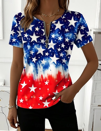 Amerikanischer Unabhängigkeitstag Damen T Shirt Druck Grafik Flagge Stilvoll Klassisch Lässig Kurzarm V Ausschnitt Normale Oberteile Täglich Blau Rote Rot / Blau Sommer Frühling