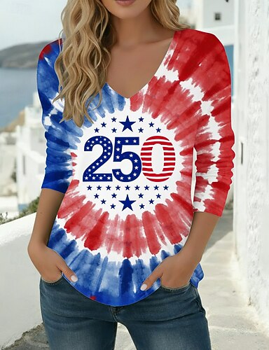 Amerikanischer Unabhängigkeitstag Damen T Shirt Druck Grafik Flagge Stilvoll Klassisch Dreiviertelarm V Ausschnitt Normale Oberteile Täglich Wochenende Blau Schwarz Rote Frühling