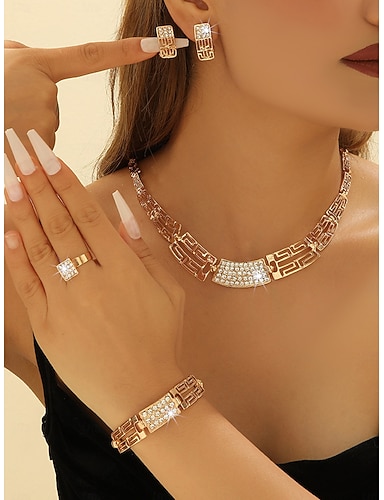 4-teiliges vergoldetes Schmuckset für Damen – geometrische Strasskette, Ohrringe, Armband &Ring, luxuriöse Brautaccessoires für Hochzeiten &Partyveranstaltungen