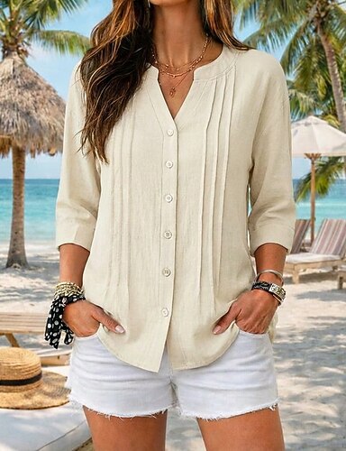 Damen Bluse Kunstbaumwollleinen Knöpfe Einfarbig Einfach Stilvoll Lässig Dreiviertelarm V Ausschnitt Lange Oberteile Täglich Weiß Hellgrün Marineblau Braun Aprikose Sommer Frühling Herbst