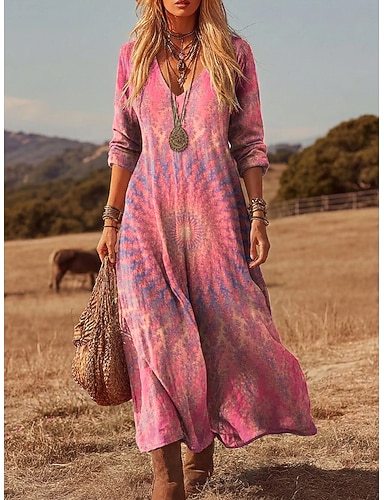 Damen Maxi Kleid Boho T-Shirt Kleid Tee Kleid Lässig Täglich Lockere Passform Abstrakt Lange Ärmel V-Ausschnitt Blau Rosa Rot Sommer Frühling