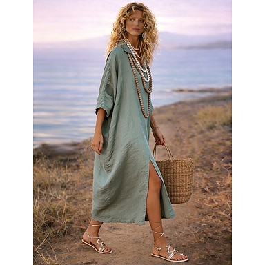 Damen Midikleid Kunstbaumwollleinen Kaftan Kleid Modern Täglich Outdoor Urlaub Lässiger Schnitt Einfach Langarm Hemdkragen Grün Sommer Frühling