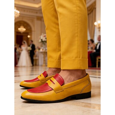 Rote und gelbe Herren-Slipper, auffälliges Design, ideale Hochzeitsschuhe für Gäste und Trauzeugen, stilvolles und bequemes formelles Schuhwerk