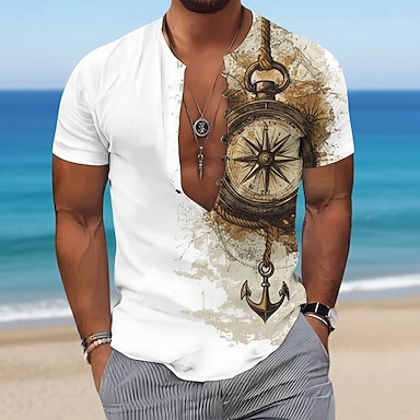 Herren Nautisch Anker Kompass Hemd Popover-Hemd Stehkragenhemd Kurzarm Vintage-Retro Lässig Täglich Strandurlaub Sommer Frühling Kragenlos 3D-Druck Blau Weiß Khaki