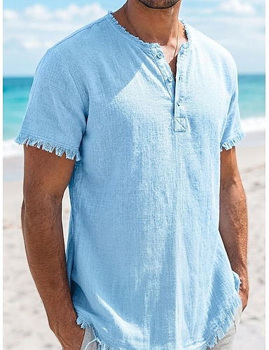 Herren T-Shirt Leinen-T-Shirt Kurzarm Kurze Ärmel Henley Sommer Einfach Mode Designer Basic Weich Rohkante Lässig Strand Urlaub Blau Weiß Rosa Top T-Shirt für Herren