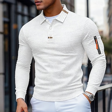 Herren Waffel-Poloshirts Textur Straße Lässig Revers Langarm Basic Modern Einfach Texture Patchwork Knöpfe Frühling Herbst Ganzjahres Normale Passform Schwarz Weiß Armeegrün Grau Waffel-Poloshirts