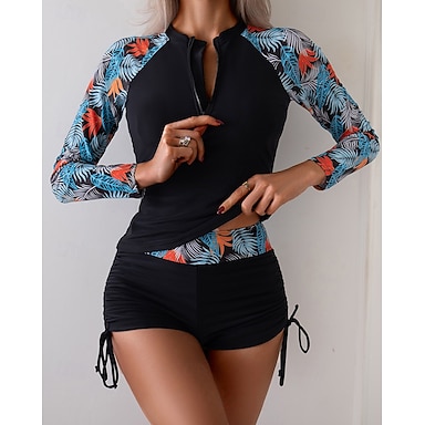 Damen Tankini 2-teiliges Badeanzug Reißverschluss vorne Palm Shorts Bauchkontrolle Hohe Taille Schlank Rücklos Urlaub Strandbekleidung Florale Blätter Hoher Ausschnitt Lange Ärmel Badeanzug