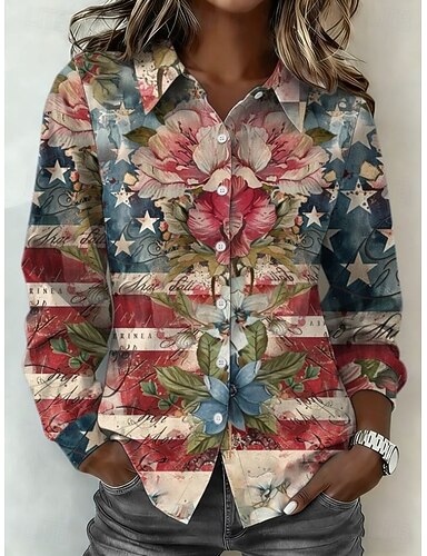 Amerikanischer Unabhängigkeitstag Damen Shirt Knöpfe Druck Grafik Amerikas Jubiläum Vintage Stylisch Modern Langarm Shirt Kragen Reguläre Oberteile Alltag Schwarz Rot Himmelblau Khaki Sommer Frühling