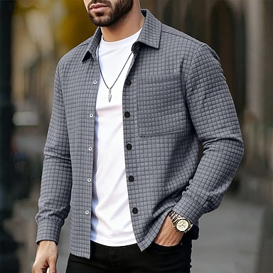 Herren Hemd Waffelhemd Freizeithemd Knopfhemd Schwarz Weiß Kaki Grau Langarm Einfach Revers Lässig Täglich Tasche Bekleidung Mode Streetwear Lässig