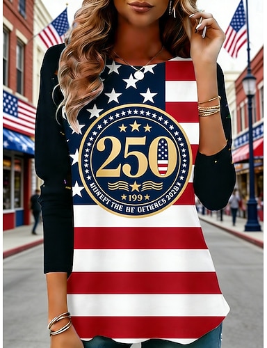 Amerikanischer Unabhängigkeitstag Damen T Shirt T-Shirt Druck Grafik Gestreift Mode Stilvoll Basic Langarm Rundhalsausschnitt Normale Oberteile Täglich Ausgehen Wochenende Blau Sommer Frühling Herbst