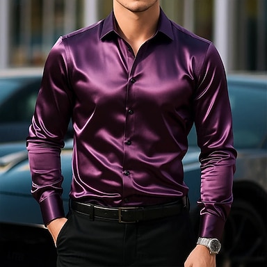 Herren Hemd Satinhemd Kleidhemd Knopfhemd Abschlussballhemd Einfarbig Hochzeit Formell Blau Silber Schwarz Weiß Langarm Umlegekragen Ganzjahres Bekleidung Klassisch