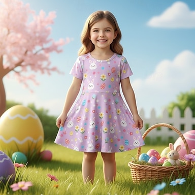 Ostern Mädchen' 3D Grafik Kaninchen Blume Kleid Kurzarm 3D-Druck Sommer Frühling Täglich Urlaub Party Niedlich Basic Lässig Kinder 4-12 Jahre Freizeitkleid A Linie Kleid Knielang Normale Passform