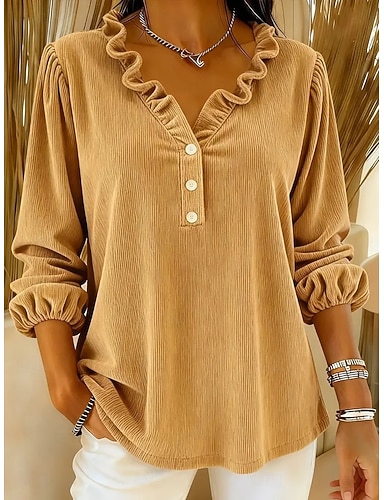 Damen Hemd Cordhemd Bluse Rüschenbluse Rüsche Einfach Stilvoll Basic Klassisch Langarm V Ausschnitt Normale Oberteile Täglich Ferien Ausgehen Gelb Rote Grün Dunkelblau Sommer Frühling