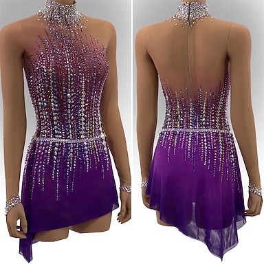 Eiskunstlaufkleid Damen Mädchen Eislaufkleid Lila Offener Rücken Asymmetrischer Saum Mesh Hohe Elastizität Training Wettkampf Eislaufbekleidung Klassisch Kristall/Strass Ärmellos Eiskunstlauf