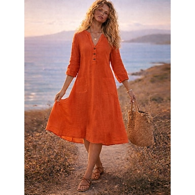Damen Midikleid Kunstbaumwollleinen Hemdblusenkleid Freizeitkleid Klassisch Modern Outdoor Urlaub Ferien Normale Passform Einfach Langarm V Ausschnitt Schwarz Purpur Orange Leicht Blau Herbst