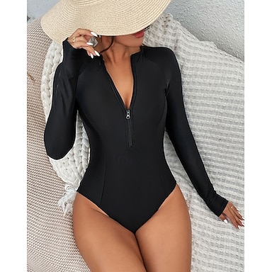 Damen Anti UV Shirt Badeanzug Bademode Einfarbig Frontreißverschluss Schnelltrocknend Leicht Atmungsaktiv Langarm Bodysuit Badeanzug Surfen Strand Wassersport Sommer