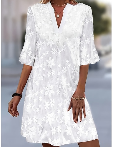 Damen Knielanges Kleid Spitzenkleid Weißes Kleid Elegant Mode Strand Urlaub Ferien Normale Passform Blumen Halbarm V Ausschnitt Weiß Sommer Frühling