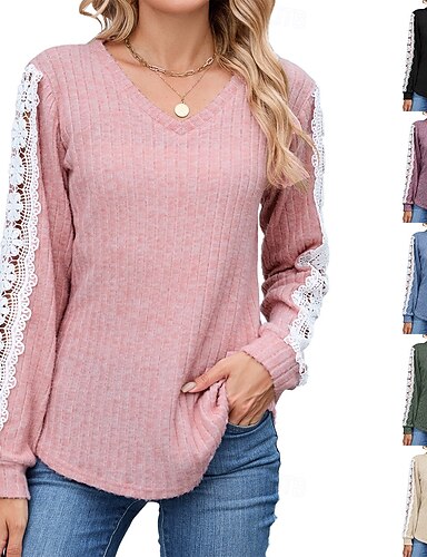 Damen Bluse Spitze Patchwork Einfarbig Elegant Stilvoll Basic Langarm V Ausschnitt Normale Oberteile Täglich Blau Schwarz Rosa Armeegrün Fuchsie Frühling Herbst Winter