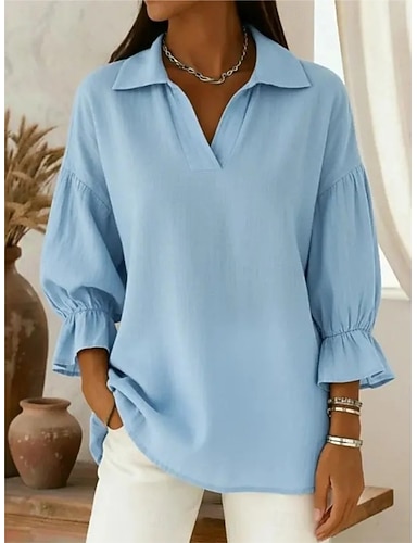 Damen Bluse Baumwollhemd Kunstbaumwollleinen Rüsche Einfarbig Täglich Stilvoll Basic Dreiviertelarm V Ausschnitt Normale Oberteile Täglich Blau Schwarz Weiß Rote Grün Sommer Frühling Herbst