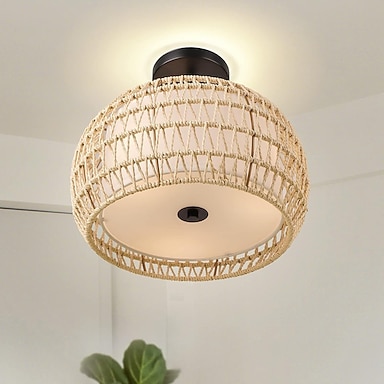 Halbbündige Deckenleuchte, dreiflammig, Bohemian-Leuchte aus geflochtenem Rattan, Deckenhalterung mit Stoffschirm, Bauernhaus-Deckenleuchte für Schlafzimmer, Küche, Foyer, Flur, 110–240 V