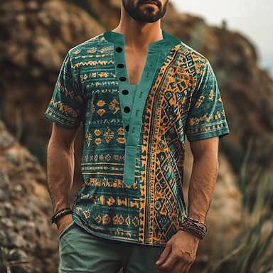 Herren Stammes Ethnisch T Shirt Henley Hemd T-Shirt Kurzarm Designer Basic Ethnisch Outdoor Lässig Täglich Sommer Grün Henley Henley T-Shirt