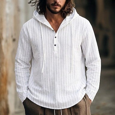 Herren Hemd Leinenhemd Sommerhemd Strandbekleidung Kapuzenhemd Gestreifte Hemden Vertikale Streifen Lässig Urlaub Schwarz Weiß Marineblau Grün Langarm Kapuzenpullover Sommer Frühling Bekleidung