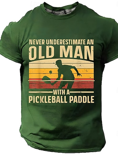 Unterschätze niemals einen alten Mann mit einem Pickleball-Schläger! Herren-T-Shirt im Vintage-Stil mit Sonnenuntergangsmotiv, humorvollem Retro-Print, Kurzarm, lässig, Designer-Kleidung, Größen S, M,