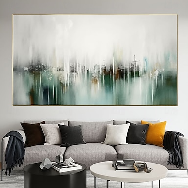 Großes, handgemaltes, abstraktes, ruhiges Landschaftsgemälde in Öl auf Leinwand, nebliges Weiß &Grüne Farbtöne, handgemalte moderne Wandkunst für das Wohnzimmer