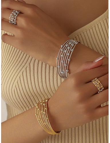 Mehrreihiges Armband- und Ring-Set aus Gold für Damen – elegantes Schmuckset aus Metalldraht für Partys, Cocktailpartys und Abendveranstaltungen.