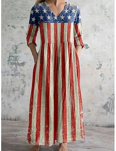 Unabhängigkeitstag Damen Maxikleid Hemdblusenkleid Freizeitkleid Mode Basic Modern Täglich Outdoor Strand Normale Passform Sternenbanner Dreiviertelarm V Ausschnitt Rote Sommer Frühling